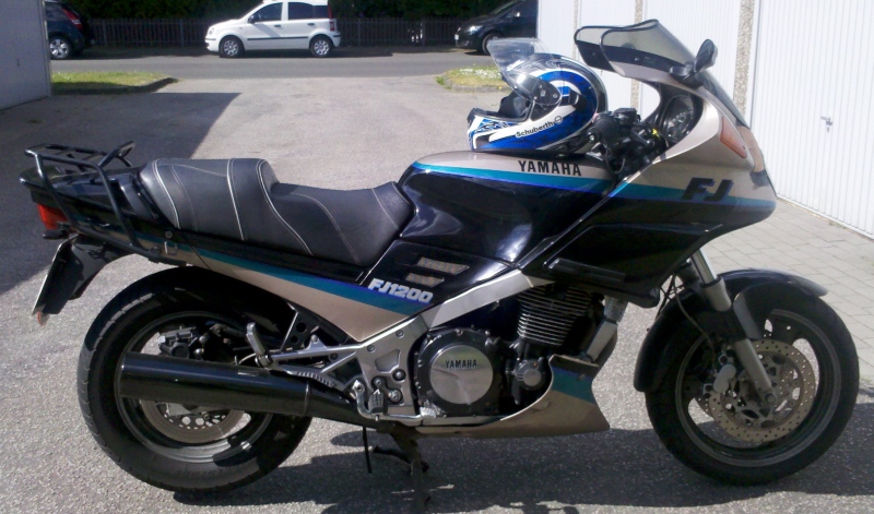 Yamaha FJ1200 4-Zylinder Reihe mit 1188ccm, 98PS bei 8500upm, 93Nm bei 6500upm, 261kg vollgetankt, 189kg Zuladung. Als MiB (Motorrad im Bergischen) mit EZ 93 und ca. 54000km gekauft. Sie ist (sehr) gebraucht und war daher (sehr) günstig. Gelsitzbank, Heizgriffe und SBK-Lenker sind ihre Extras. |