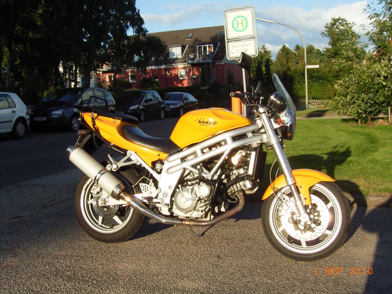 otobai (koreanisch für Motorrad) Was macht man, wenn die Guzzi während ihrer Revision länger nicht fahrbereit ist, man aber auf das so gewohne Blubbern eines V2 nicht verzichten möchte? Man schaut sich um... Fündig wurde ich über Ebay in Flintbek. Die GT650 ist Baujahr 2004, hatte beim Kauf keine 10Mm gelaufen. Der vordere Zylinderkopf war vom Werk vorsorglich getauscht worden. Von mir bekam sie 130er Hauptdüsen, die Nadel wurde höher gehängt und der CO-Wert wurde von traumatischen 0,6% auf ebenso gesunde wie legale 3,6% gestellt. Mein Schwager meinte nach 200Km mit ihr nur: Fahrspass pur! |